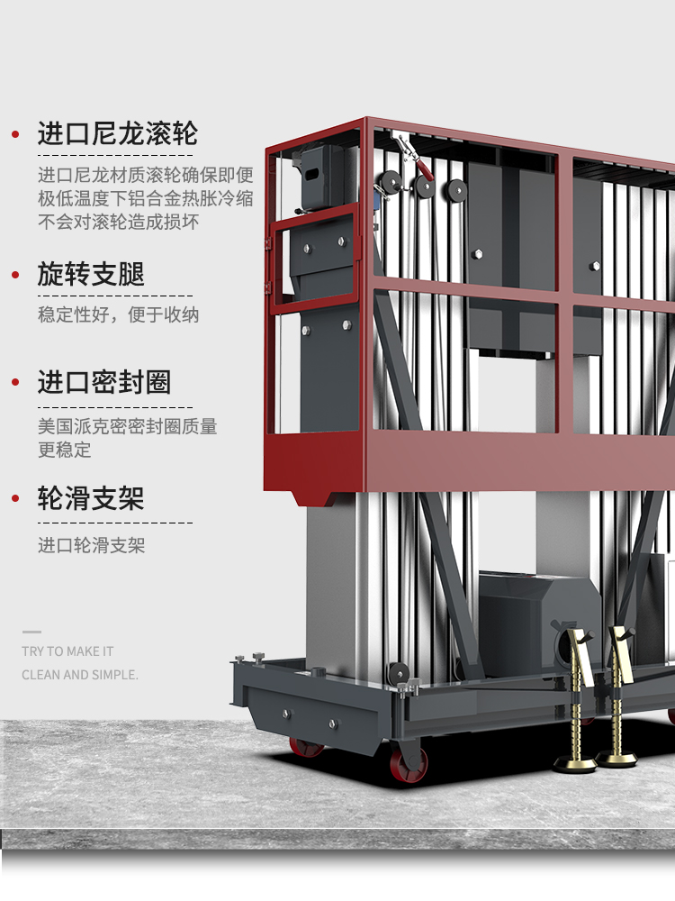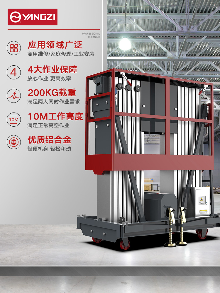 揚(yáng)子升降平臺(tái)YZ-DS2:應(yīng)用廣泛,4大作業(yè)保障設(shè)置,承載量打穩(wěn)如磐石,可以輕松移動(dòng),緊急斷電防誤操作,雙控制臺(tái),雙操作更安心更方便,還擁有防爆閥等優(yōu)質(zhì)選材